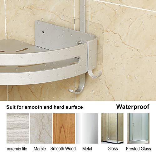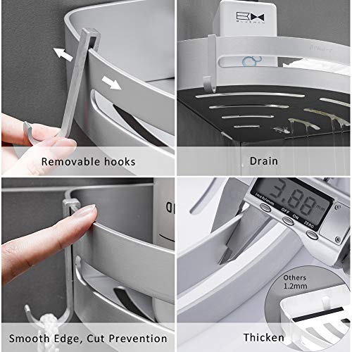 Starke Aufkleber – Jeder Klebriger Schrauben kann bis zu 20kg tragen, 1 extra ersetzte Klebriger Schrauben mitgeliefert. Große Kapazitäten – Bietet genügend Platz für die Seife, Shampoo, Gesichtsreiniger, Lotion, Pinsel und so weiter, 2 Haken an der Unterseite und 4 bewegliche Haken dienen zum Aufhängen von Handtüchern oder Duschschwamm.