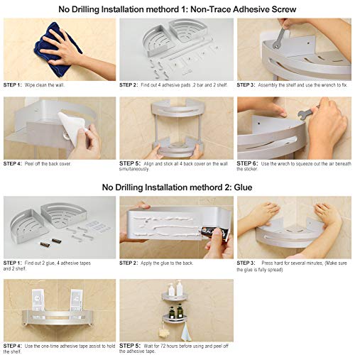 2 Methoden der Installation ohne Bohren – Aufkleber und Klebstoff. Aufkleber sind geeignet für jede glatte Oberfläche, kleben Sie das Duschregal aber nicht auf bemalte Wände oder Tapeten. (Paket enhält 2 Klebstoffe, die für glatte und raue Oberflächen geeignet sind.)Bitte kontaktieren Sie den Verkäufer, Bitte wenden Sie sich an den Verkäufer, wenn das Regal kratzt oder das Regal fällt, wird der Verkäufer Ihnen helfen, sich zu ändern.