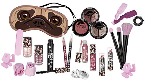 Bevat: rouge, nagellak, kajalstift, getinte lippenbalsems, slaapmasker in mops-design, badroses en nog veel meer.
