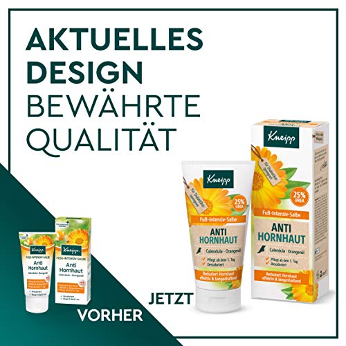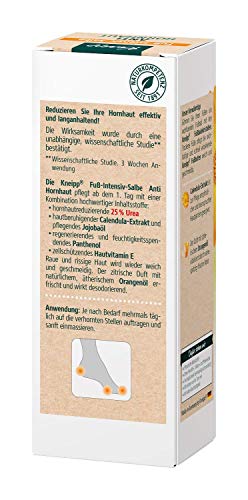 Die regenerierende Salbe reduziert Hornhaut nachweislich bereits nach 7 Tagen (Unabhängiges Testinstitut: Anwendung Kneipp Anti-Hornhaut-Salbe über 4 Wochen; 40 Probanden (z. T. Diabetiker)). Schrunden und Schwielen werden vermindert und die Haut erhält ihre Elastizität und Widerstandskraft zurück. 25% Urea wirkt effektiv und schnell hornhautreduzierend, lässt raue und rissige Haut verschwinden.